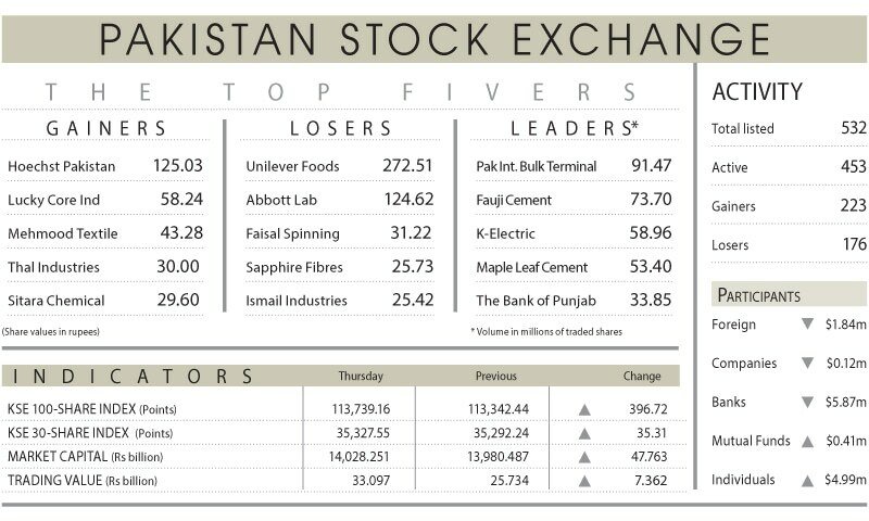 A Topline Securities Ltd disse que o índice de referência KSE 100 mostrou uma tendência positiva, fortalecida por fortes resultados da empresa. Ele atingiu 114.202 pontos e terminou com 113.739 pontos, ganhando 397 pontos ou 0,35% do dia.