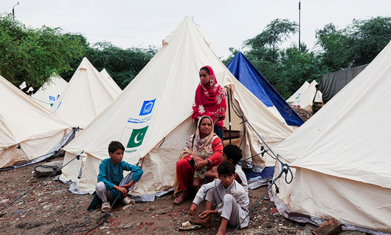 Imagem do cabeçalho: Sakinabibi, mãe de quatro filhos que escapou da área inundada, fica do lado de fora da barraca como abrigos perto de Lahore junto com outros.