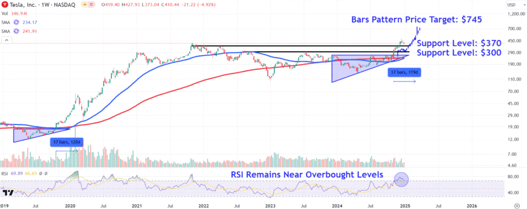 As ações da Tesla subiram nas últimas duas sessões, após uma seqüência de cinco dias de perdas que fez com que as ações perdessem 18% de seu valor. Apesar da recente retração, as ações têm apresentado tendência de alta desde que romperam o triângulo ascendente no início de novembro, após as eleições presidenciais dos EUA. A análise do padrão de barras prevê um preço-alvo de aproximadamente US$ 745, prevendo que a atual tendência ascendente pode continuar até o início de março. Observe os principais níveis de suporte próximos a US$ 370 e US$ 300 no gráfico da Tesla.