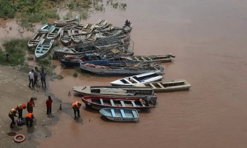 As equipes de resgate prepararam barcos nas margens do rio Rabbi em 27 de agosto em Lahore, após avisos de inundação depois que a Índia abriu os portões de uma grande represa ao rio após fortes chuvas.