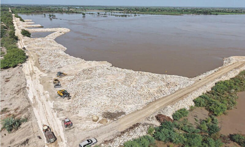Larkana: As inundações sempre danificam os diques e, portanto, uma luta de 24 horas está em andamento para evitar a devastação.