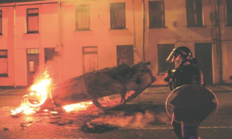 Ballymena: Na terça -feira, a polícia atacou a polícia na cidade de Ballymena na Irlanda do Norte, atacou a polícia e queimou suas casas e carros.